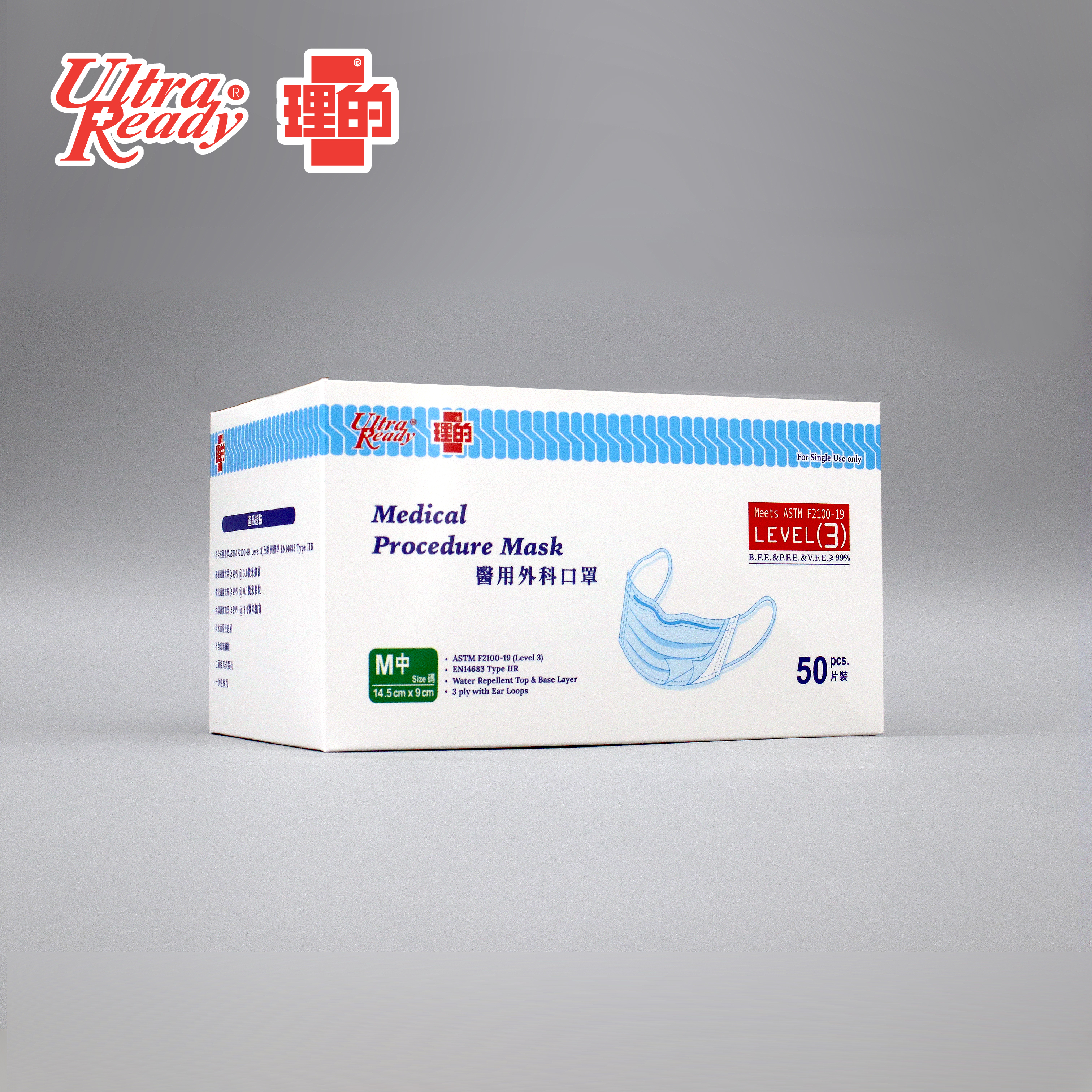 理的 - 醫用外科口罩非獨立包裝 (14.5cm x 9cm) - 中碼 50片裝